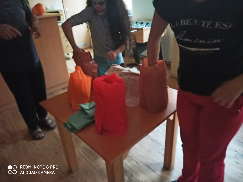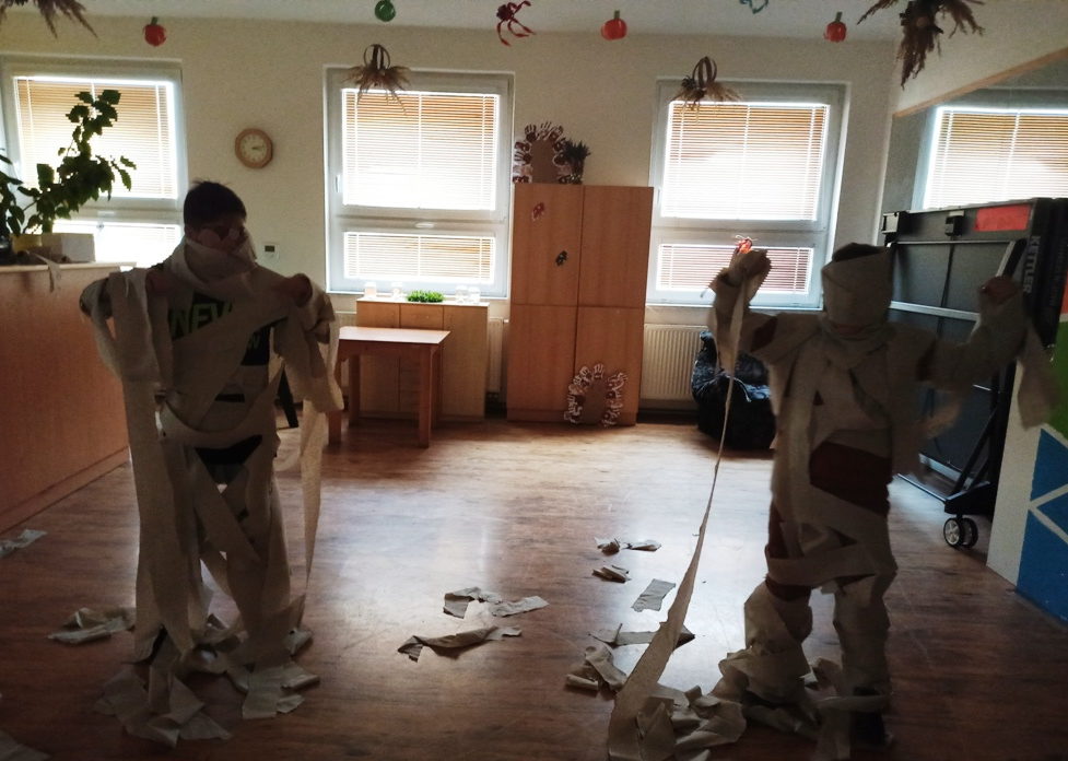 První disciplína byla „Mumie“ – co nejvíce a důkladně omotat kapitána týmu toaletním papírem, jako mumii. Druhé byly „kuželky“, které se sestřelovaly pomocí dýně. Třetí disciplína všechny pořádně potrápila. V zamaskovaných lahvích museli za daný časový limit vytáhnout co nejvíce figurek. Nebylo to ale jen tak. Lahve totiž byly naplněny například pudinkem, špagetami nebo granulemi ve tvaru králičích bobků, vše obarveno krvavým barvivem. Čtvrtý „Strašák“ spočíval v oblečení kapitána týmu co nejvíce kusy oblečení. Abychom si procvičili i mozek, tak pátá disciplína byla v zapamatování co nejvíce připravených předmětů. A jako poslední disciplína „jablíčko“ se všem zdála, jako jednoduchý úkol. Ale jak sami zjistili, tak není tak jednoduché v míse s vodou vylovit bez pomocí rukou jablko.